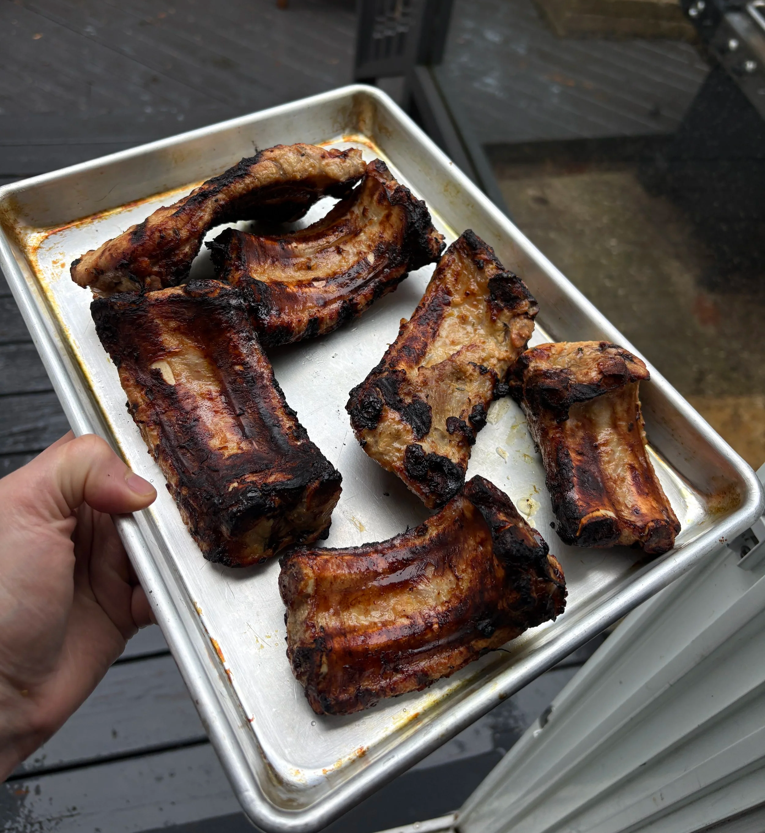 Pull the ribs from the marinade and rub off all onions, herbs, garlic slices, etc.