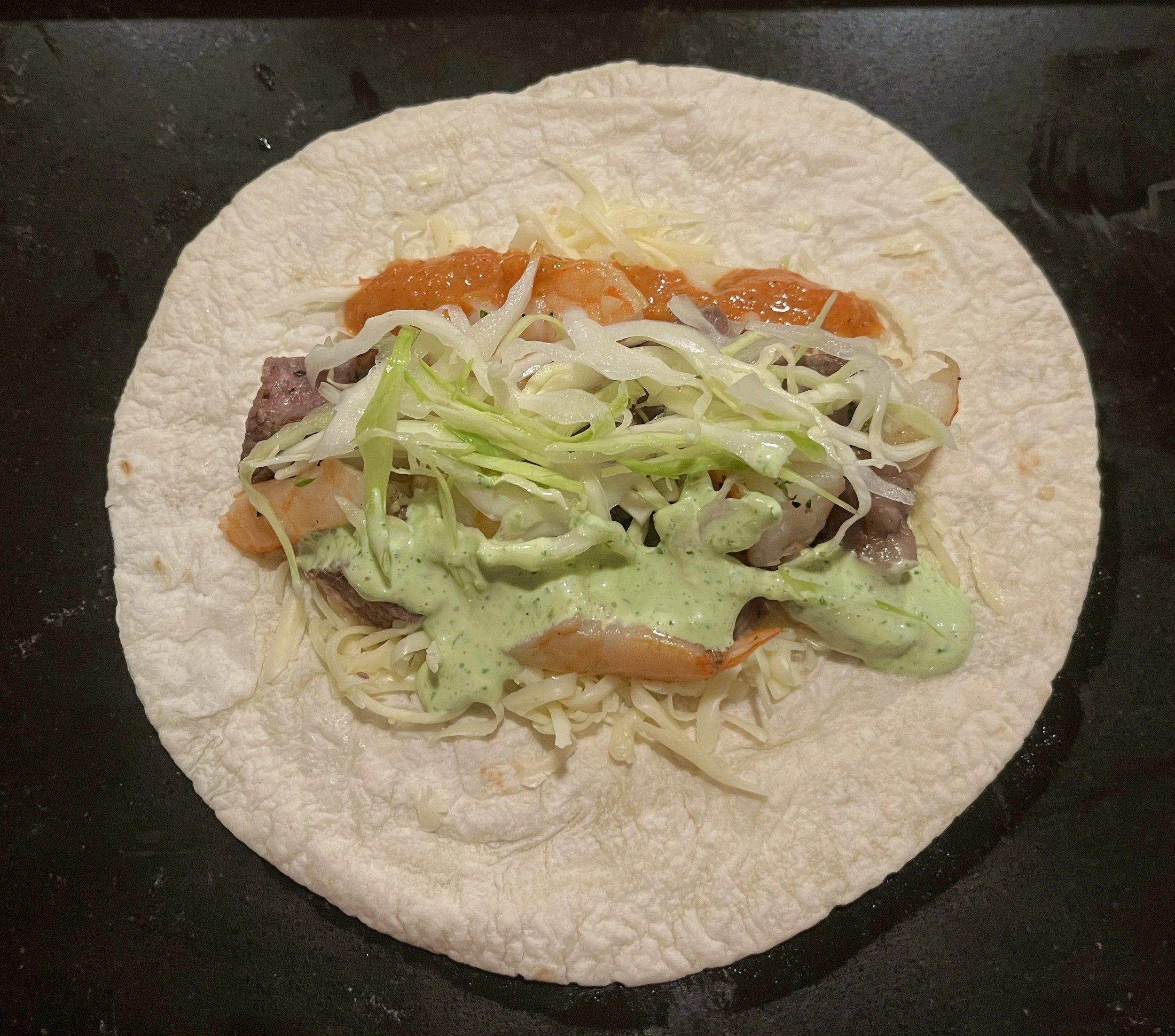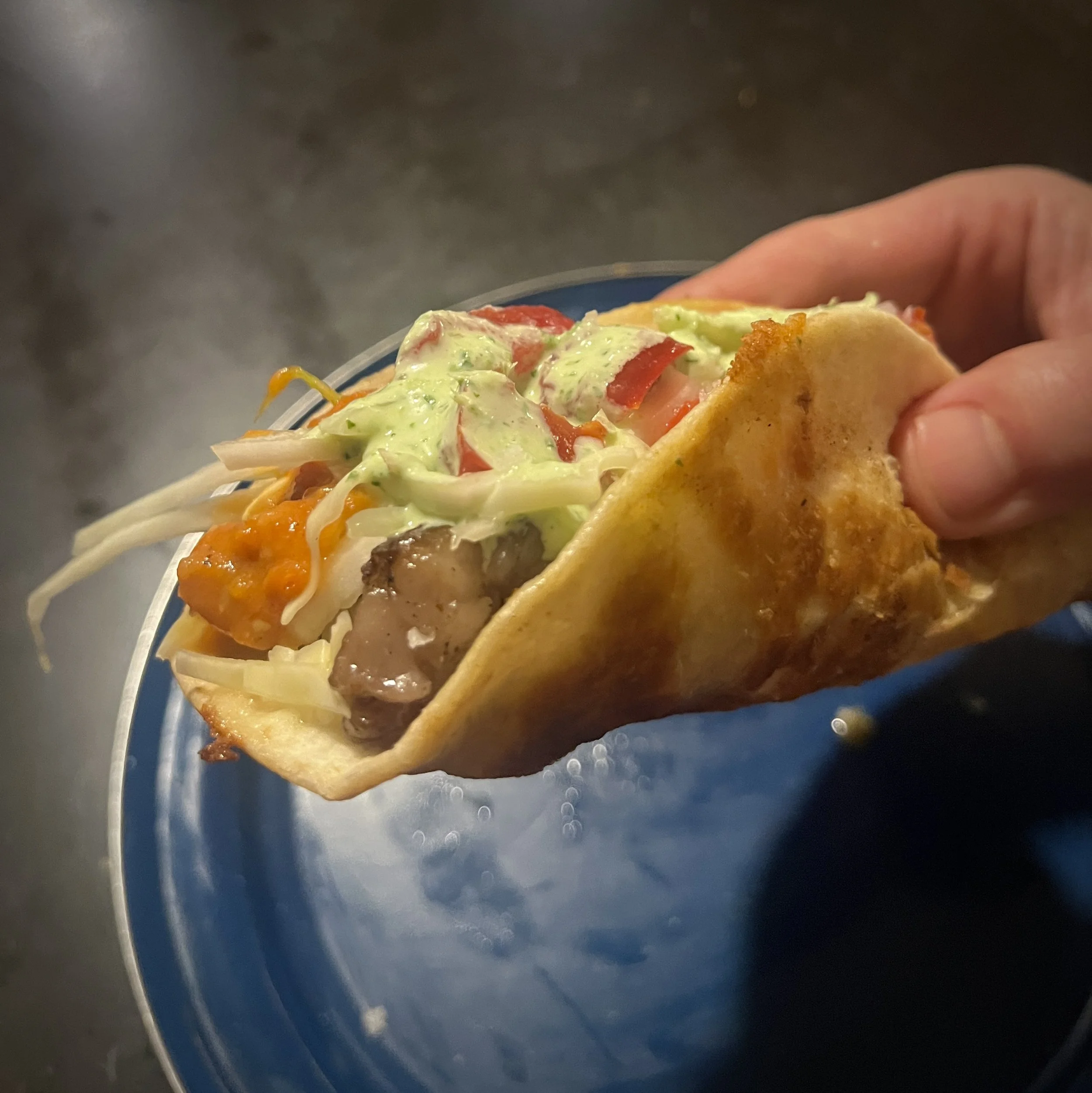 Also works well as a taco! Place the tortilla with cheese a top in the pan, allow the tortilla to brown and the cheese to melt and then top with all the fixings