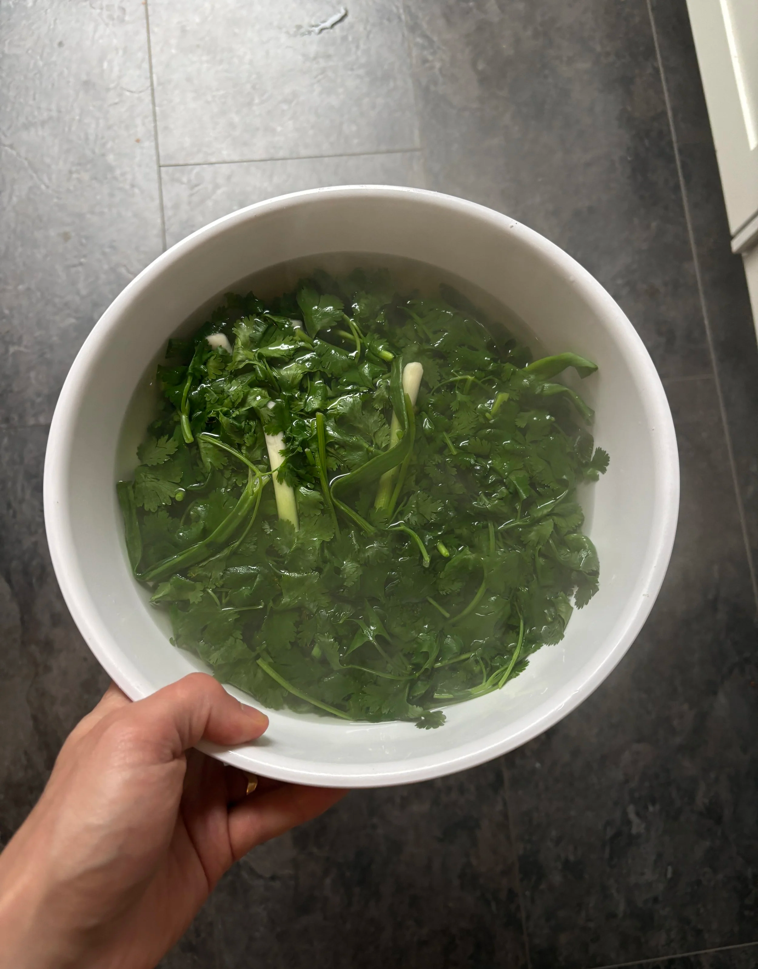 Stir the herbs and green onions in the hot water and then immediately transfer them to an ice bath to prevent any cooking