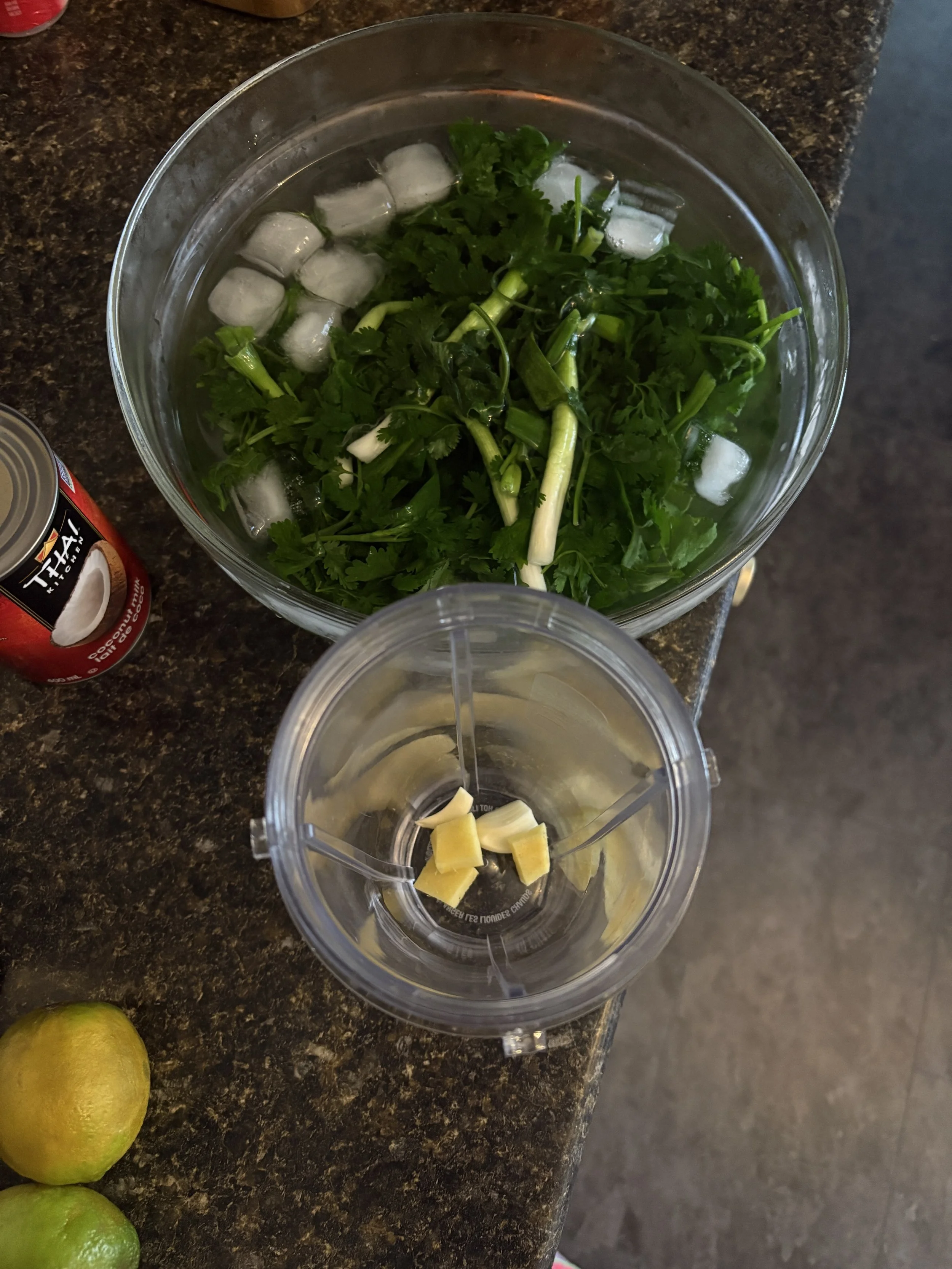 Add the blanched herbs and green onions to a food processor or blender, along with a few ice cubes from the ice bath
