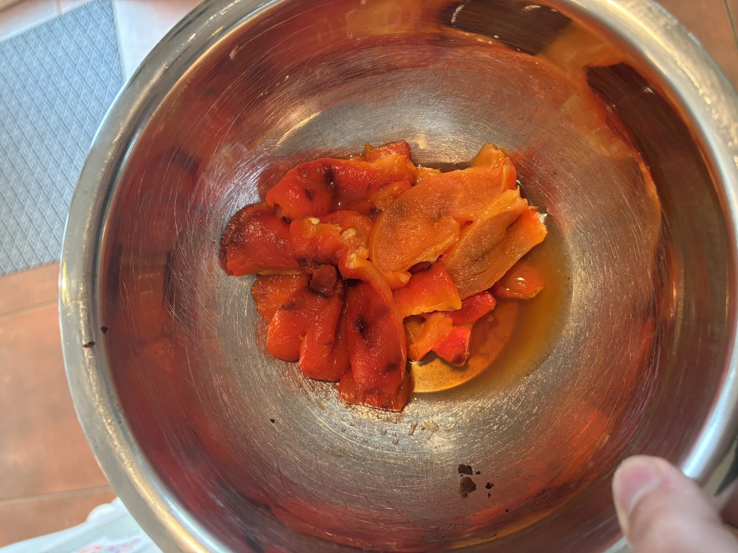 After the peppers have cooled slightly peel the blackened skin off and discard the seeds