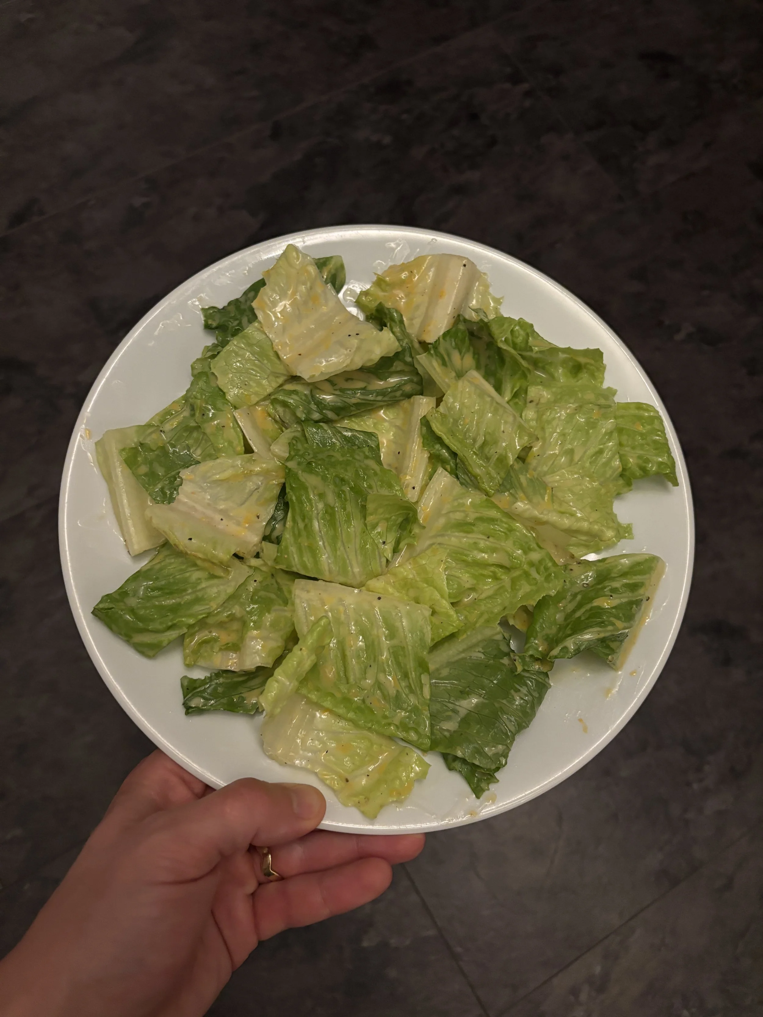 Toss the Romaine in the large bowl with a generous amount of dressing
