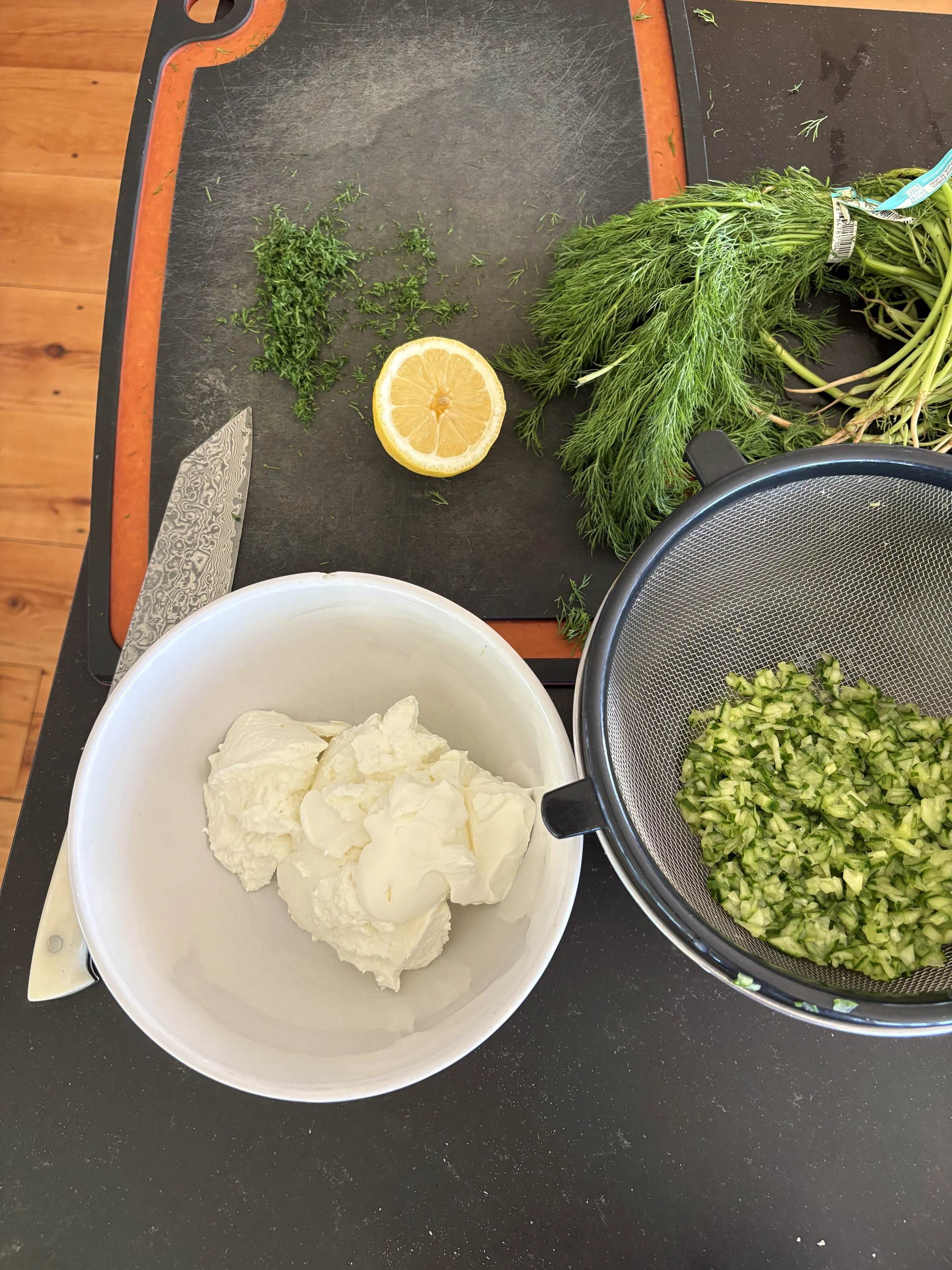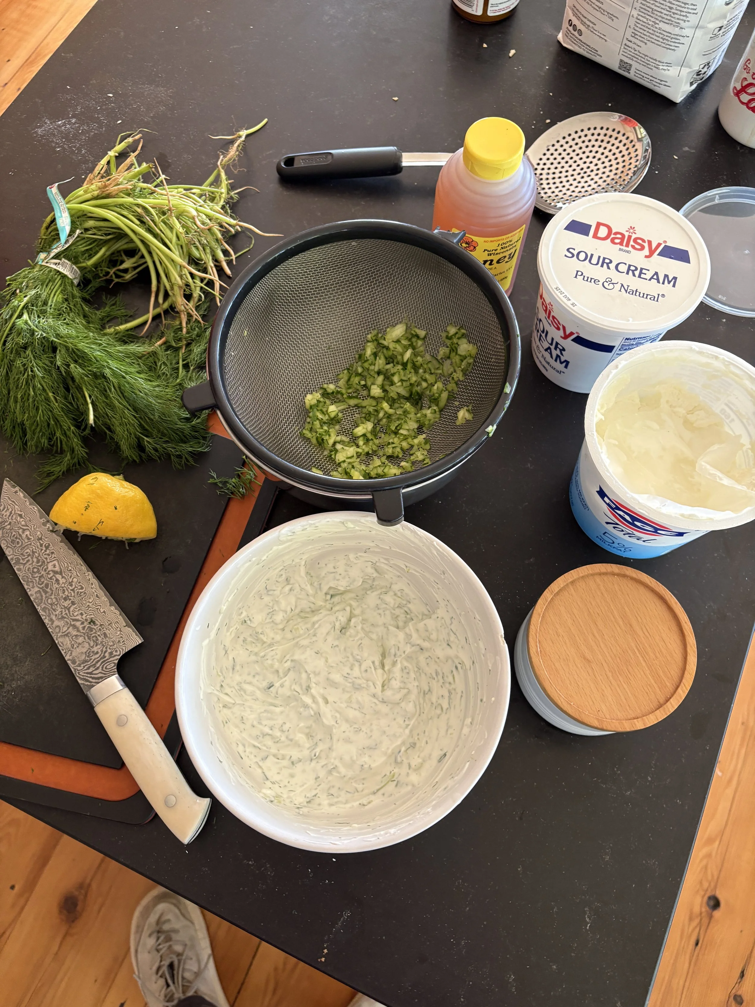 Meanwhile, mix the yogurt, sour cream, honey, lemon, dill, and parsley